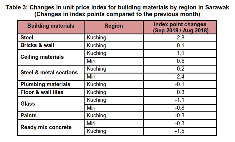 The Building Material Cost Index (BCI) (without steel bars and with steel bars) for several categories of building in Kuching showed changes in September as compared to August 2018. In contrast, the BCI in Miri for almost all categories of building decreased as compared to the previous month. Meanwhile, the BCI in Sibu was unchange.