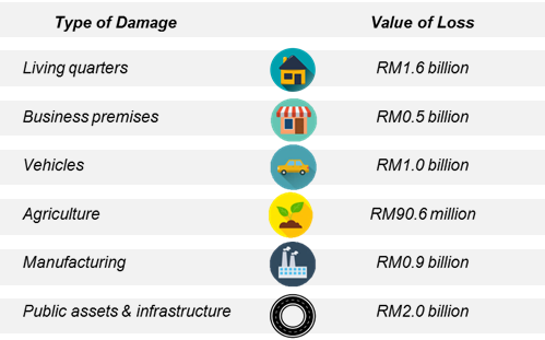 Overall losses due to the floods recorded RM6.1 billion which equivalent 0.40 per cent as against nominal Gross Domestic Product. Living quarters losses were RM1.6 billion, business premises RM0.5 billion, vehicles RM1.0 billion, agriculture RM90.6 million, manufacturing RM0.9 billion and public assets & infrastructure RM2.0 billion as shown in Exhibit 1.