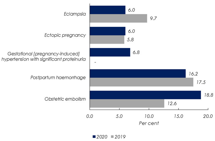 Obstetric embolism was recorded as the principal causes of death for maternal in 2020 at 18.8 per cent followed by Postpartum haemorrhage (16.2%), Gestational [pregnancy-induced] hypertension with significant proteinuria (6.8%), Ectopic pregnancy (6.0%) and Eclampsia (6.0%).