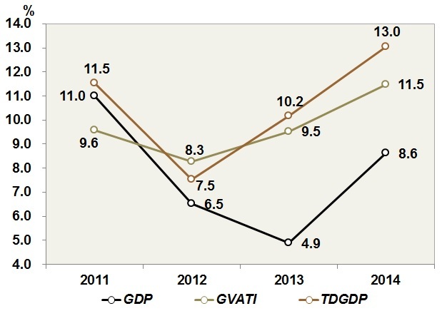 The share of Gross Value Added of Tourism Industries (GVATI) to Gross Domestic Product (GDP) elevated to 13.7 per cent in 2014 as against 13.4 per cent in 2013. GVATI recorded a value of RM151.7 billion with a robust growth of 11.5 per cent (2013: 9.5%) as shown in Chart I. The double-digit growth was impelled by retail trade industry, food & beverage and accommodation.
