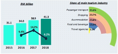 Tourism industry continued to record a better performance in 2018. The share of GVATI to GDP elevated to 15.2 per cent in 2018 as against 14.6 per cent in 2017. GVATI recorded a value of RM220.6 billion, sustained a double-digit growth of 10.0 per cent (2017: 10.3%). This growth was supported by retail trade and food & beverage with a combined share of 63.6 per cent.