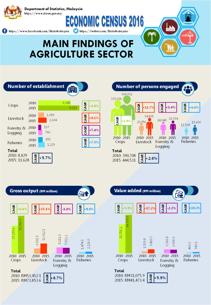 In 2015, number of establishments operating in the agriculture sector was 11,628 establishments with an annual growth of 5.7 per cent. Gross output in 2015 was RM73,853.6 million, an increase of 6.7 per cent per year compared to RM53,452.1 million in 2010 while value added for this sector was RM41,473.4 million.
