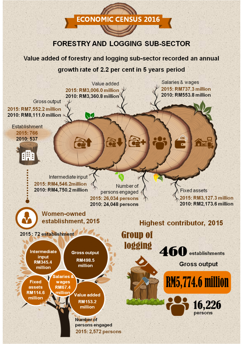 In 2015, number of establishments involved in the forestry and logging sub-sector was 766 establishments. Gross output value was RM7,552.2 million or 10.2 per cent from total gross output of the agriculture sector with value added of RM3,006.0 million. This sub-sector also provides job opportunities to 26,034 people with salaries & wages paid amounting RM737.3 million.
