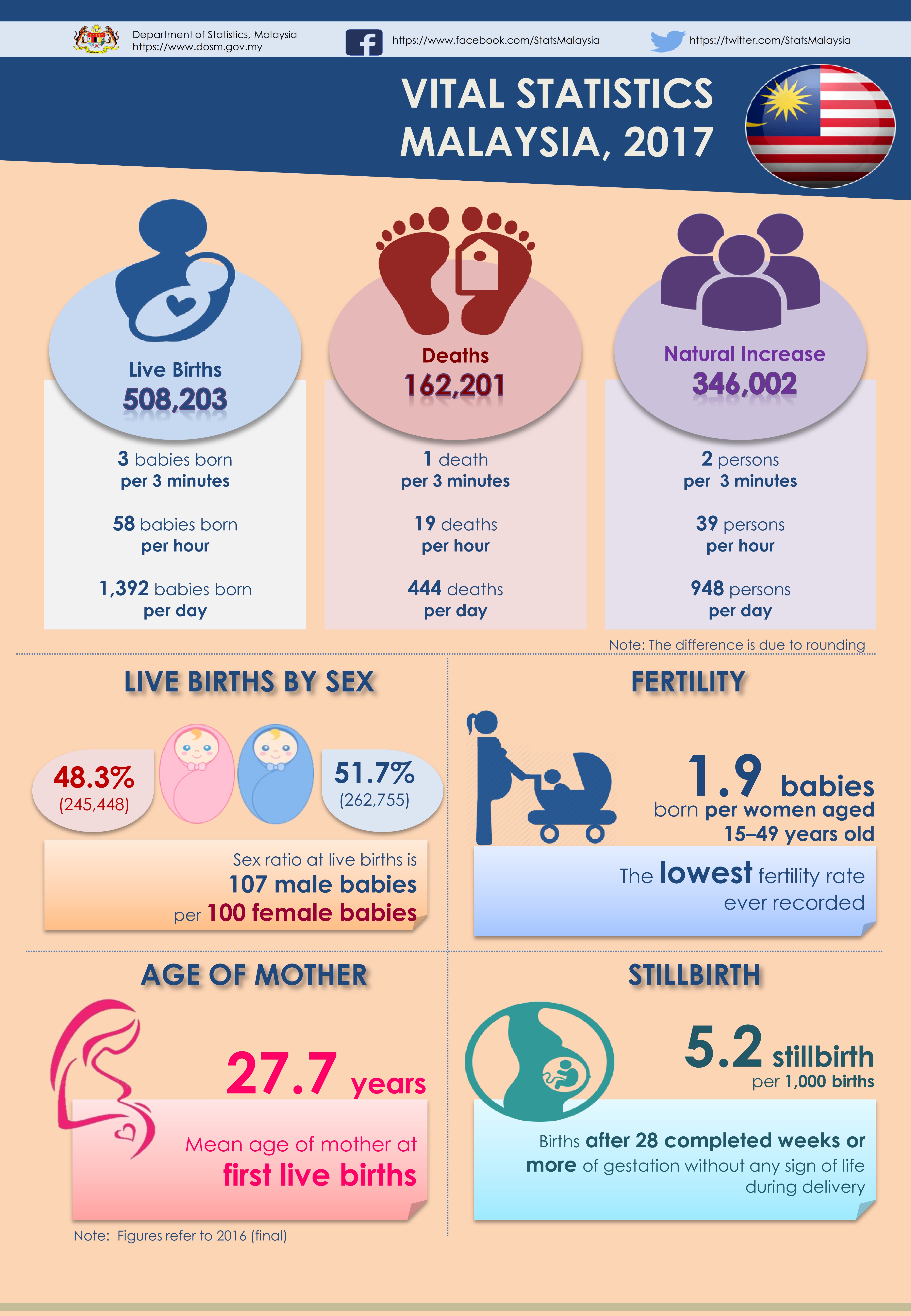 The number of live births recorded in 2016 was 508,203 babies with a decrease of 2.5 per cent as compared to 2015 (521,136). The crude birth rate declined from 16.7 (2015) to 16.1 (2016) per 1,000 population.
