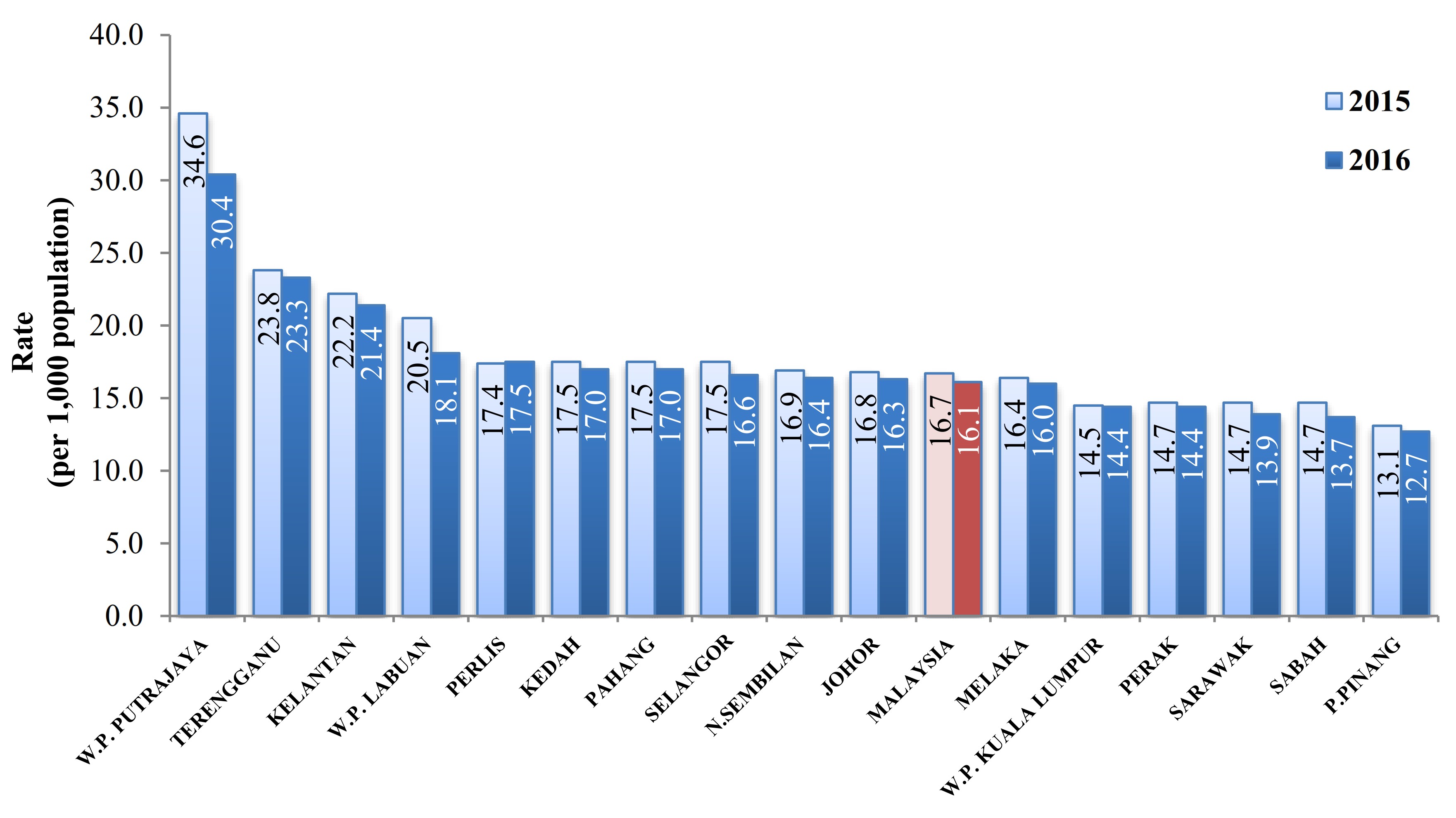 The highest crude birth rate by state in 2016 was recorded by W.P. Putrajaya (30.4) while the lowest was Pulau Pinang at 12.7 per 1,000 population.
