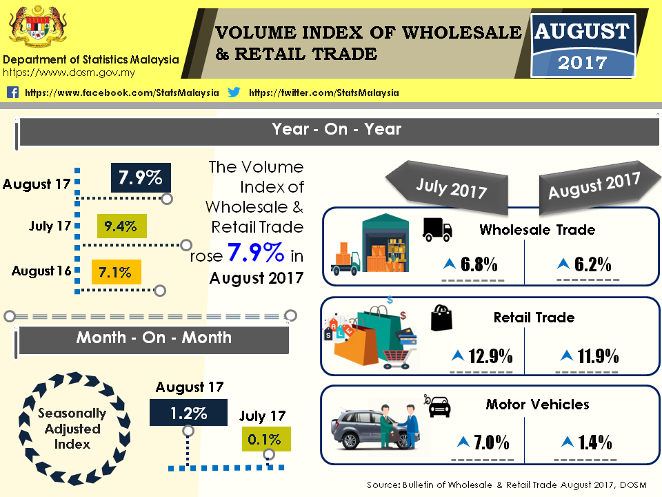 Sales value of Wholesale & Retail Trade stood at RM97.7 billionin August 2017, registering 9.8 per cent growth as compared to the corresponding period in 2016. The sales value consists of Wholesale Trade ( RM47.4 billion), Retail Trade (RM38.0 billion) and Motor Vehicles (RM12.3 billion) businesses.The positive growth was contributed by Retail Trade (13.4%).