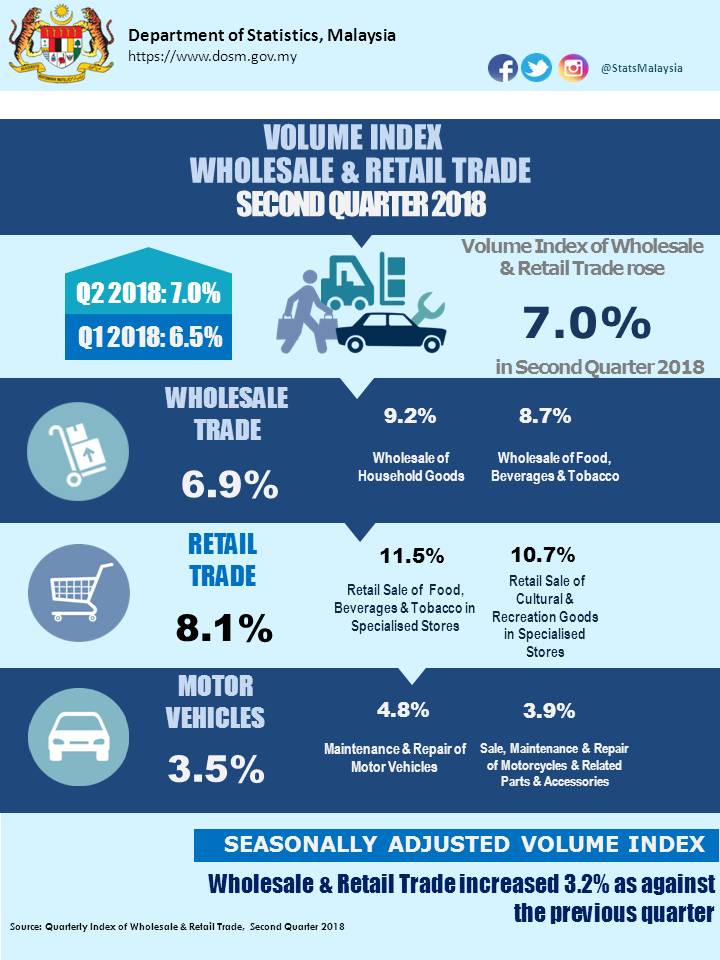 Volume index of Wholesale Trade grew 6.9 per cent to 177.2 points in the second quarter 2018 as compared to second quarter 2017. The growth was supported mainly by Wholesale of Household Goods ( 9.2%) and Wholesale of Food, Beverages and Tobacco (8.7%).