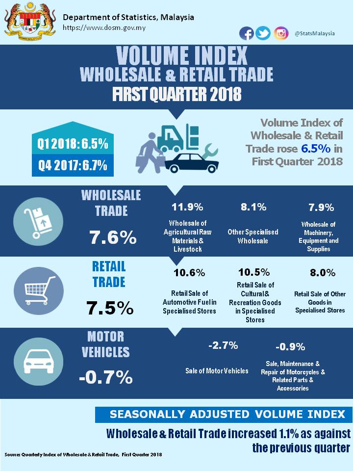 Volume Index of Wholesale & Retail Trade grew 6.5 per cent to 163.1 points in first quarter 2018 as compared to the same period in 2017. The growth was supported mainly by expansions in Wholesale Trade and Retail Trade sub-sectors, with 7.6 per cent and 7.5 per cent respectively.