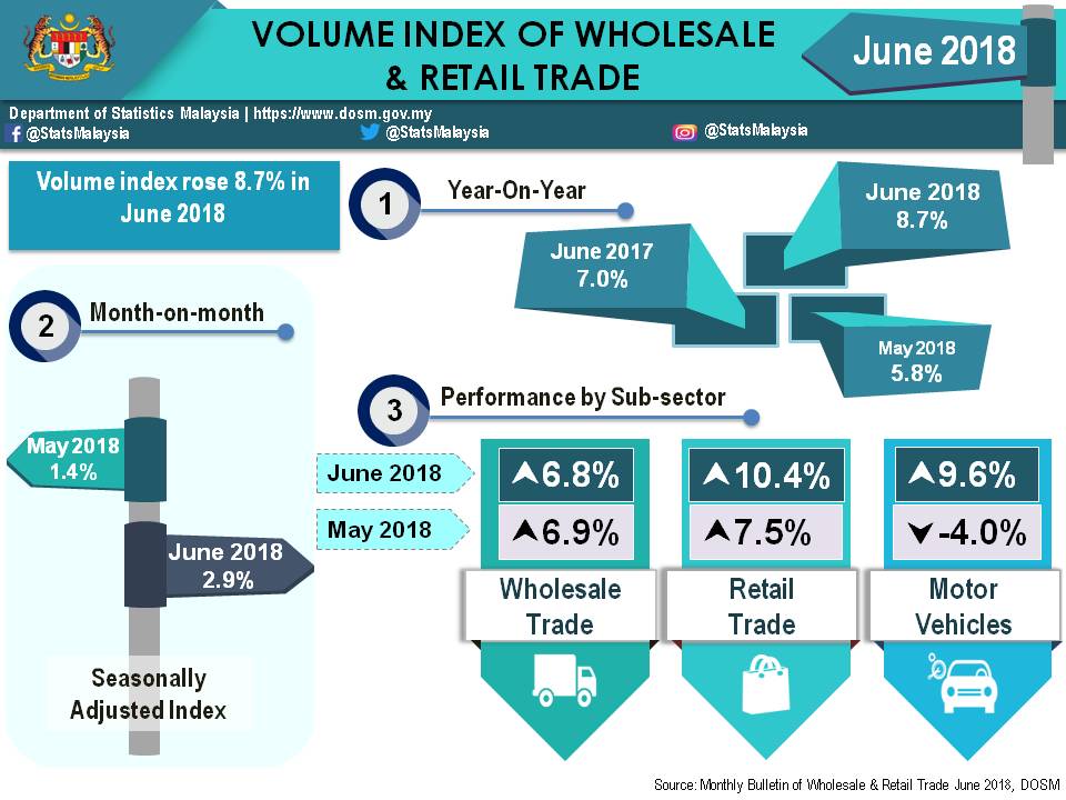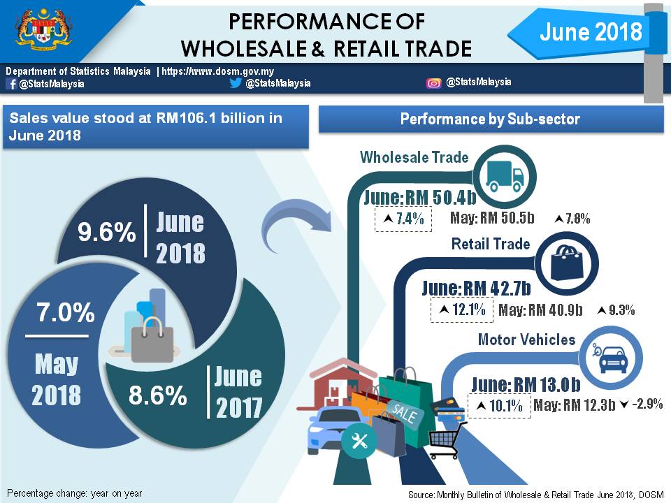 Sales value of Wholesale & Retail Trade amounted for RM106.1 billion in June 2018. In terms of growth, the sales value increased 9.6 per cent as compared to the corresponding period in 2017, driven by Retail Trade (12.1%) and Motor Vehicles (10.1%).
