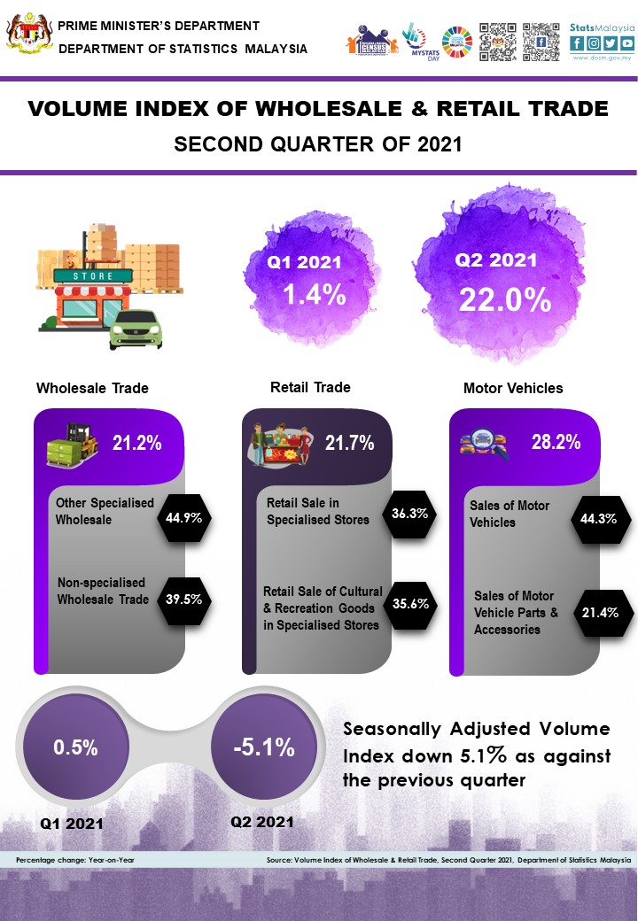 The full publication of the Quarterly Volume Index of Wholesale & Retail Trade, Second Quarter 2021 can be downloaded from eStatistik portal.