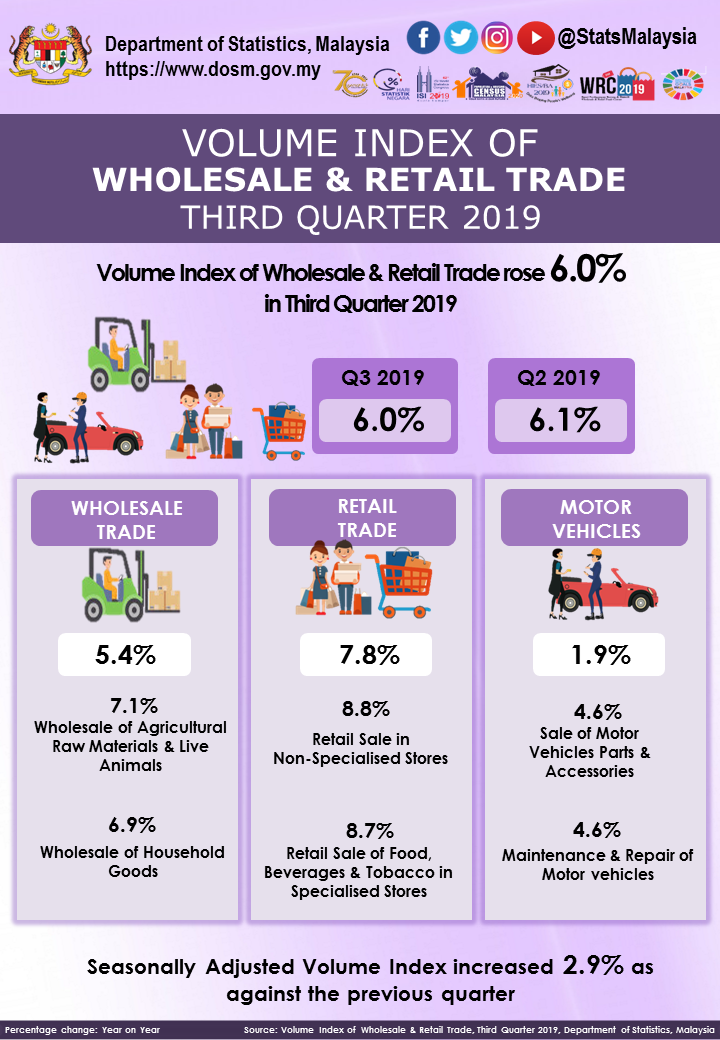As for seasonally adjusted volume index, it increased 2.9 per cent as against the second quarter of 2019. Wholesale Trade and Retail Trade recorded a positive growth of 3.6 per cent and 3.3 per cent respectively. Meanwhile, Motor Vehicles contracted 1.1 per cent as compared to the previous quarter.
