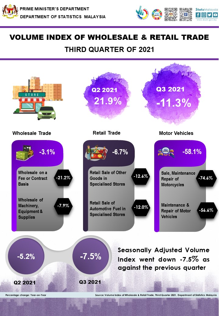 The full publication of the Quarterly Volume Index of Wholesale & Retail Trade, Third Quarter 2021 can be downloaded from eStatistik portal.