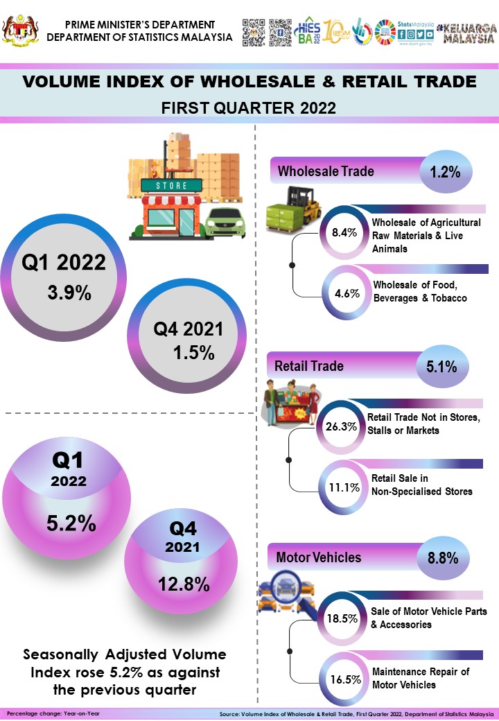 The full publication of the Quarterly Volume Index of Wholesale & Retail Trade, First Quarter 2022 can be downloaded through eStatistik Portal.