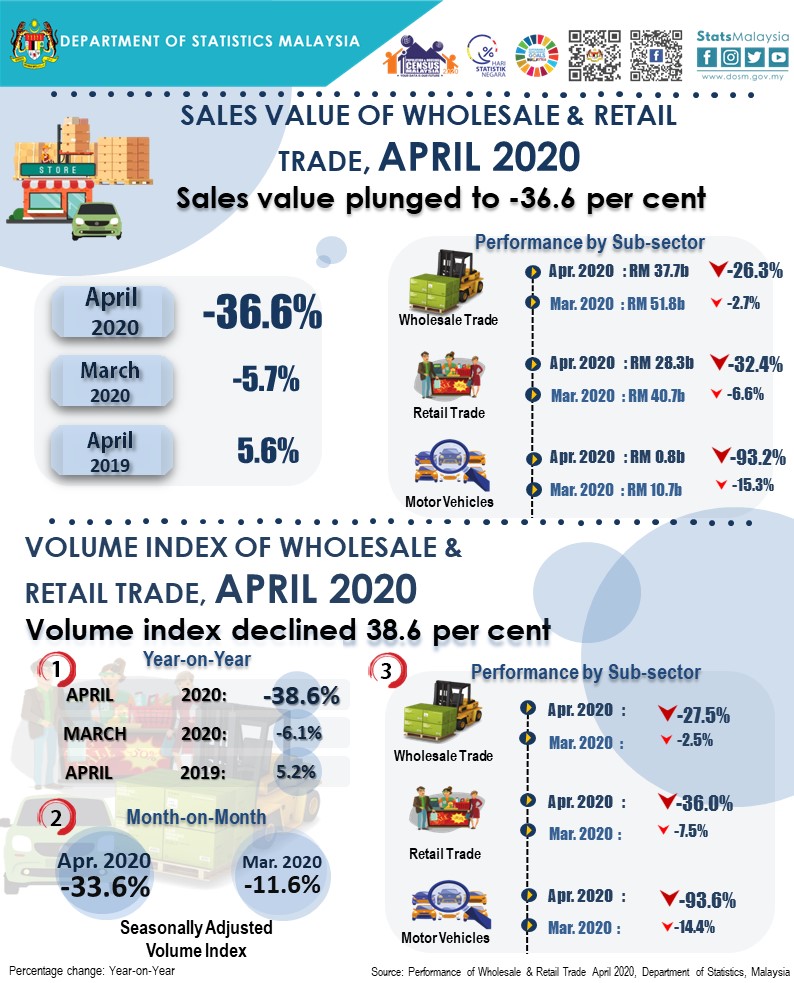 A total of RM66.9 billion was recorded by sales of Wholesale & Retail Trade in April 2020, a decrease of RM38.5 billion or -36.6 per cent as compared to the same month a year ago. The decline was caused by Retail Trade which dropped RM13.5 billion (-32.4%). Similarly, Motor Vehicles and Wholesale Trade also declined by RM11.5 billion (-93.2%) and RM13.5 billion (-27.2%) respectively.