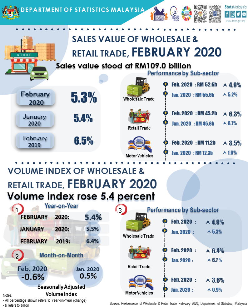 The full publication of the Performance of Wholesale & Retail Trade, February 2020 can be downloaded from eStatistik portal.
