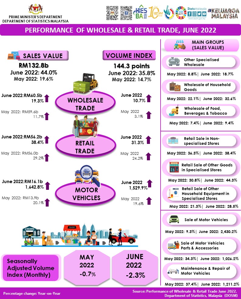 Sales  value of  Wholesale &  Retail Trade  recorded  RM132.8 billion in June 2022, registered a growth  of  44.0 per cent  year-on-year. The  positive  growth was  contributed  by all  sub-sectors,  namely  Motor  Vehicles  1,642.8 per cent,  Retail Trade 38.4 per cent; and Wholesale Trade 19.3 per cent.